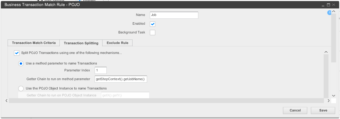If we would leave the transaction definition like that, we could not tell which call is for which job. We definitely want different transaction definitions for different jobs. We can accomplish this via ‘Transaction Splitting’, so switch to the tab with the same name. Check ‘Split POJO Transactions using one of the following mechanisms…’, then check ‘Use a method parameter to name Transactions’. The second parameter of the execute method is the ChunkContext, and if we call getStepContext().getJobName() on it, we get the job name, which would be a perfect discriminator for our business transaction. So we choose ‘1’ as ‘Parameter Index’ and ‘getStepContext().getJobName()‘ as ‘Getter Chain to run on method parameter’.
