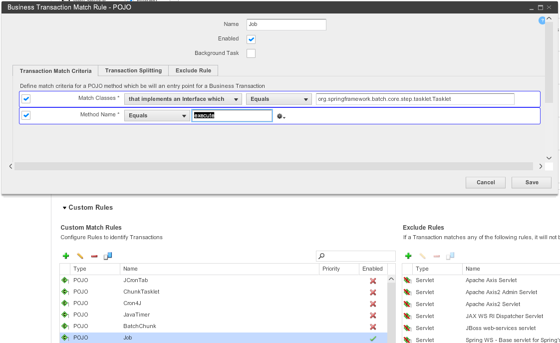 Choose ‘POJO’ as the Entry Point type, then choose a name for the transaction. In the tab ‘Transaction Match Criteria’ choose ‘Match Classes that implements an Interface which Equals org.springframework.batch.core.step. tasklet.Tasklet‘. As ‘Method Name’ type in ‘execute‘.
