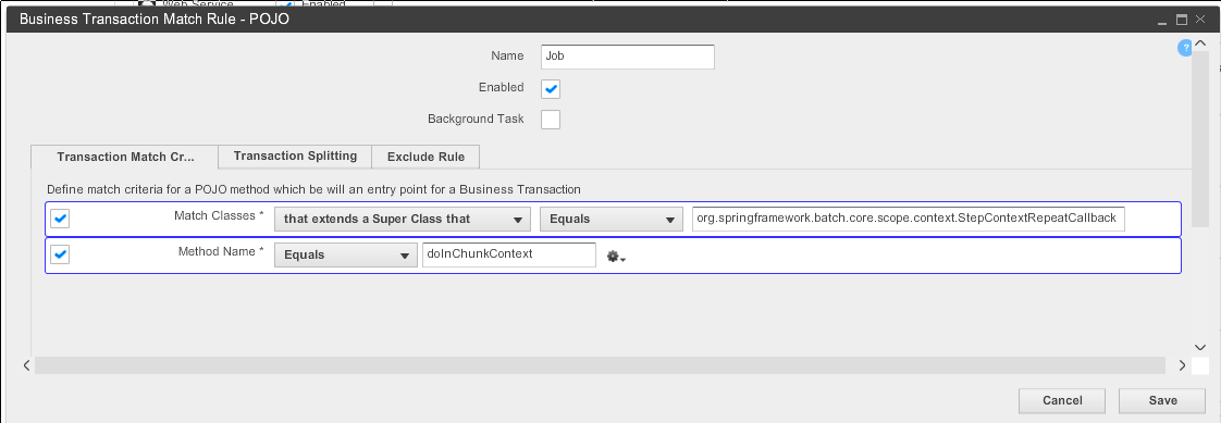 If you’re using Tasklet‘s execute method as the entry point to your business transaction, you don’t catch all processings that are done in one chunk. You are missing the update-methods of all ItemStreams, you are missing the updates on Spring Batch’s meta data tables, and you are missing the actual commit of the transaction. If that’s important for you, you can choose the following ‘Transaction Match Criteria’ in your POJO configuration: