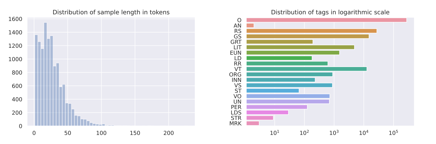 The following histograms show the distribution of sentence lengths and token annotations for this slice, where ‘O’ denotes the “empty” annotation: