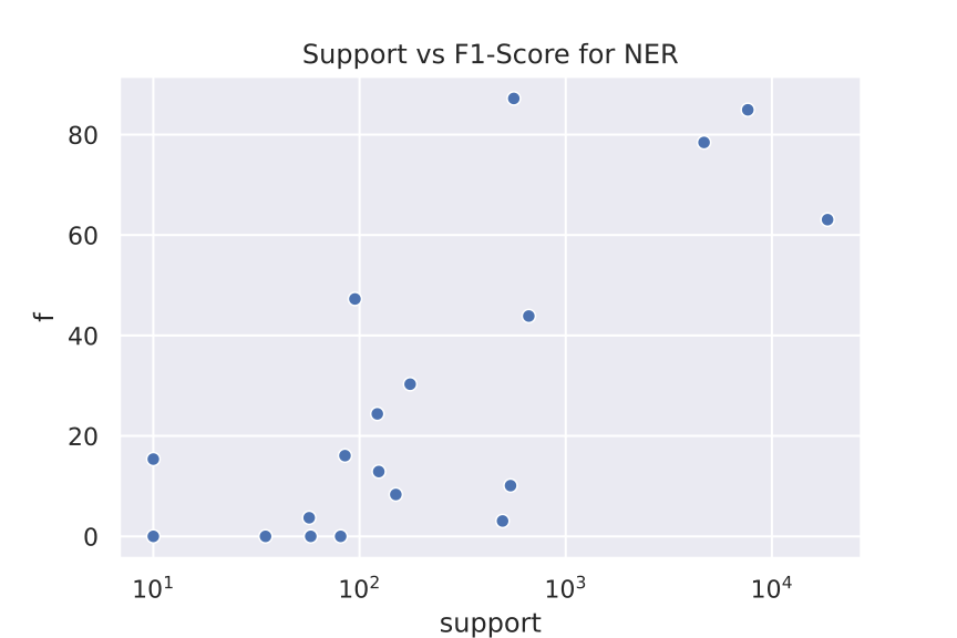 This gives a much clearer picture. Plotting the F1-Score (f) versus the number of tokens with this tag shows a correlation between poor performance and shortage of training data: