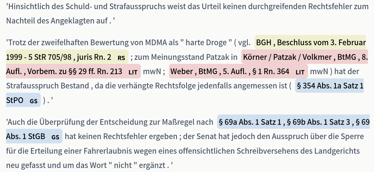 and can be found on GitHub . It consists of decisions from several German federal courts with annotations of entities referring to legal norms, court decisions, legal literature, and others of the following form: