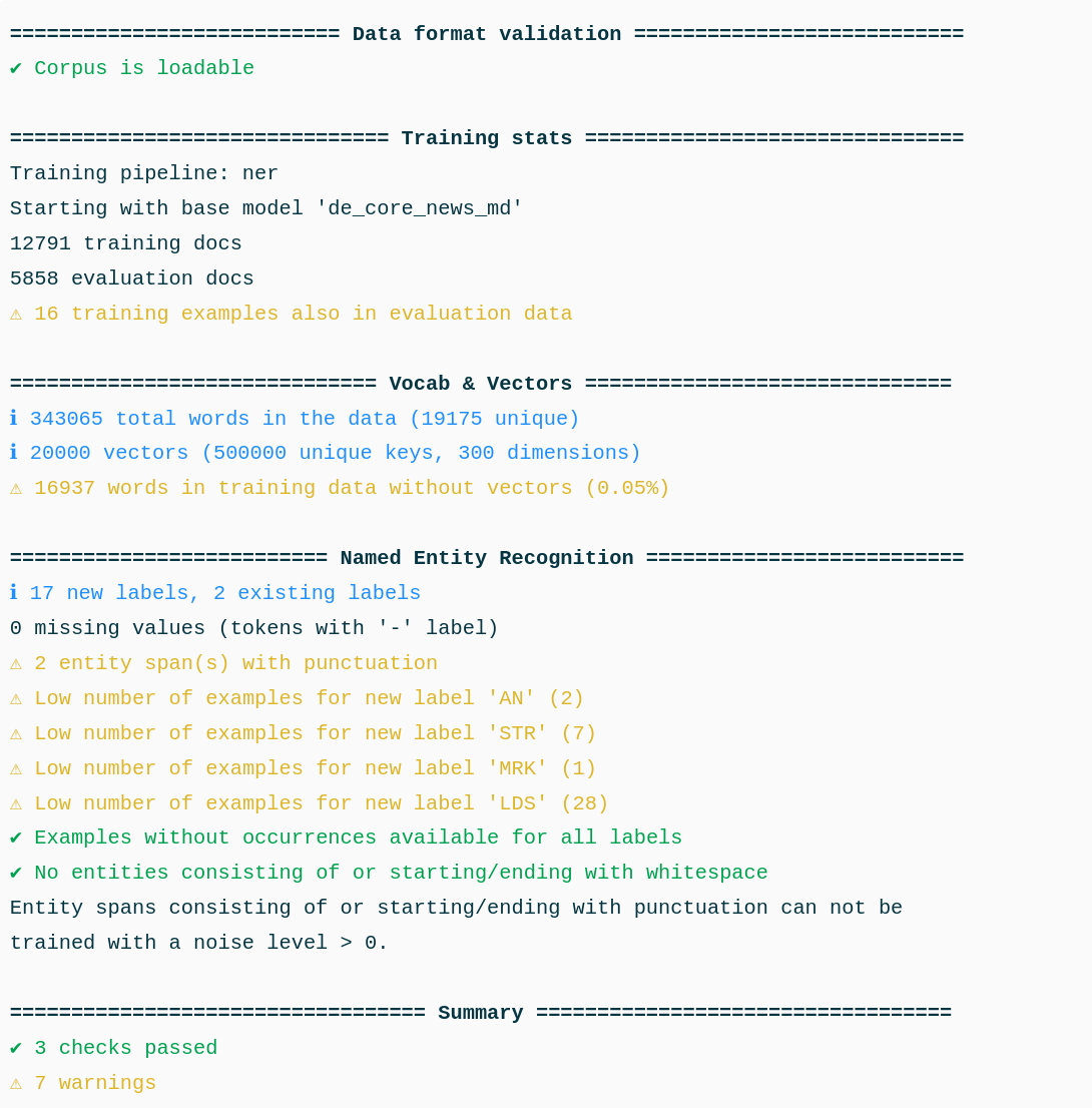 To check for potential problems before training, we check the data with spaCy’s debug-data tool: