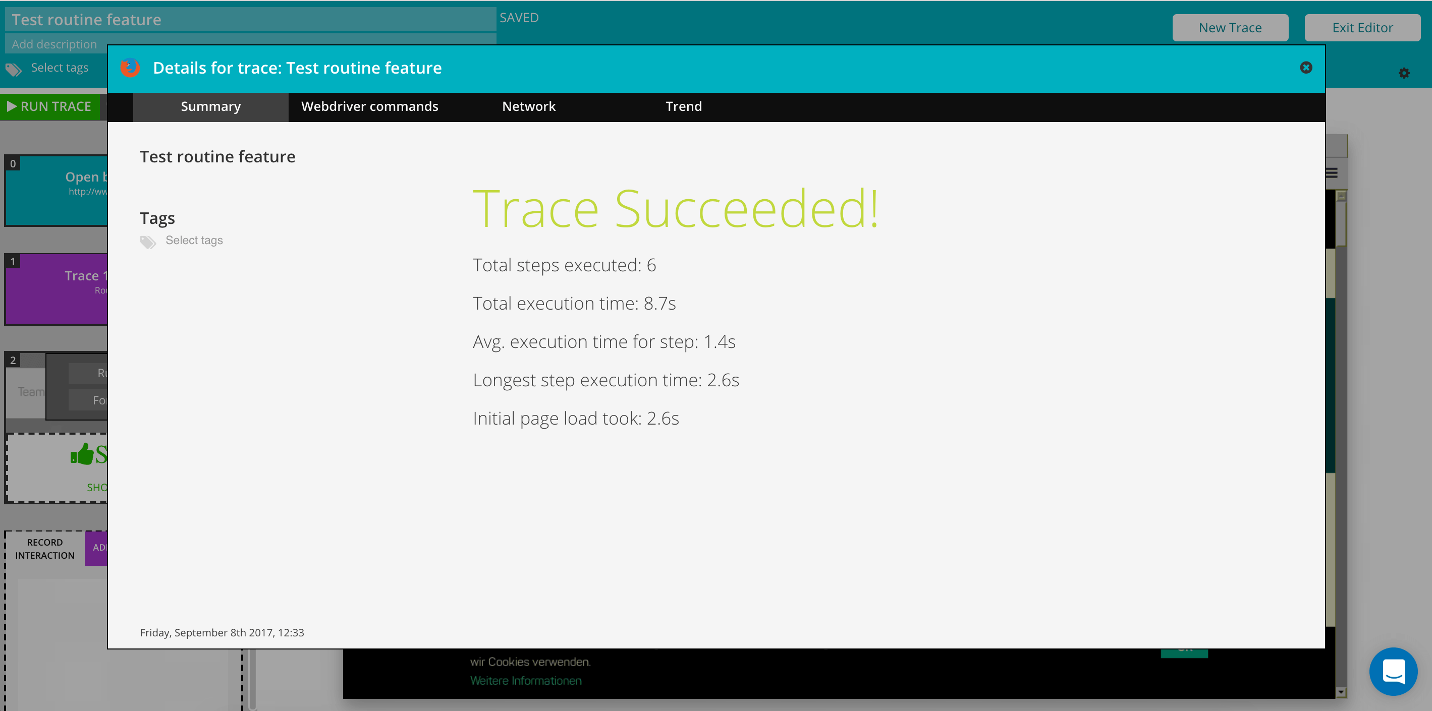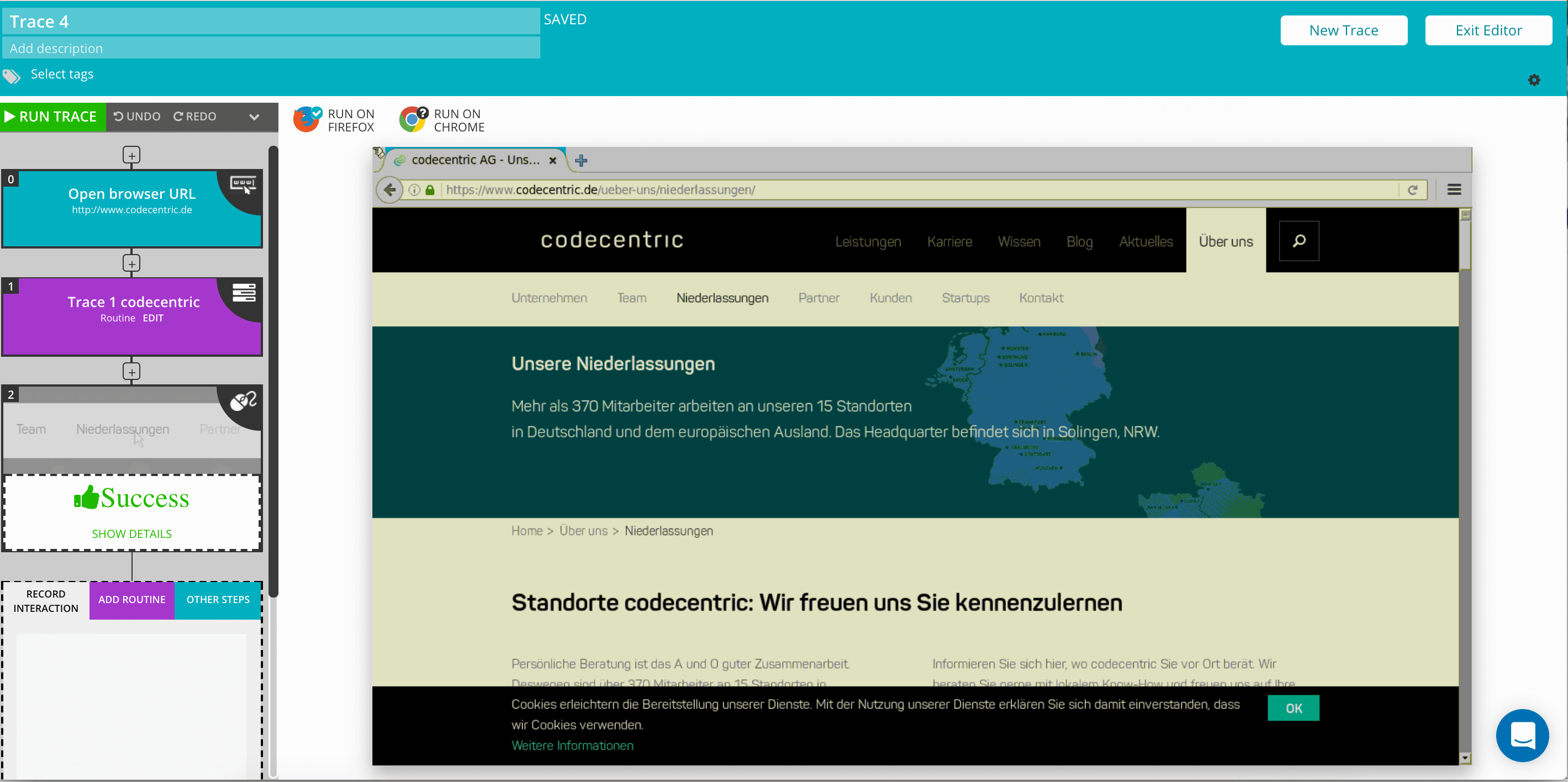 The trace (testcase) can be executed directly from the editor. The results of all executed traces can of course also be seen. Execution can be triggered for different browsers. In the free trial and the Starter edition Firefox and Chrome are supported. Internet Explorer is only supported in the Pro and Enterprise editions. An overview on the pricing and the different features of the available editions can be found from here .