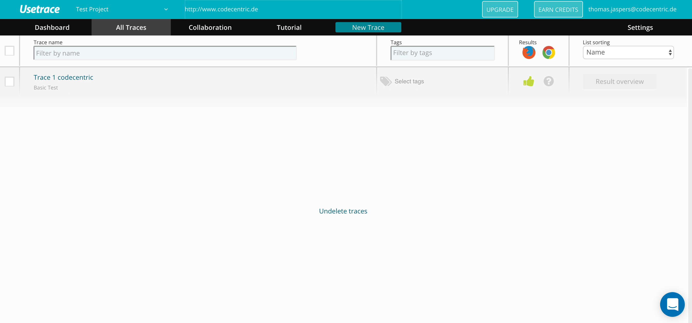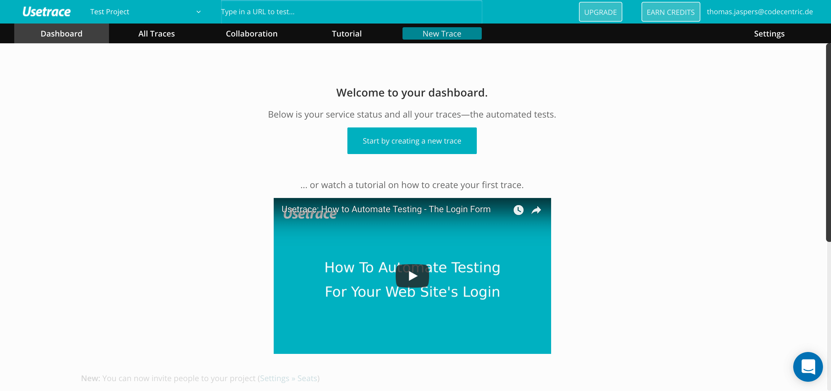 As with all cloud-based services, getting started is extremely easy, as there is no need for any local installation. After registration of a new account, Usetrace welcomes us with the above shown screen. Of course we are happily following the polite invitation to create a new trace and thus our first testcase. As usual I start by jumping into doing things and keep watching any tutorials for later. Let’s see how this works out.