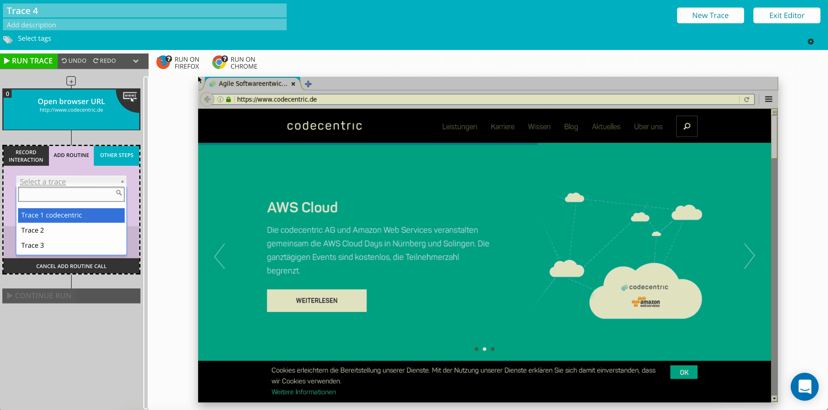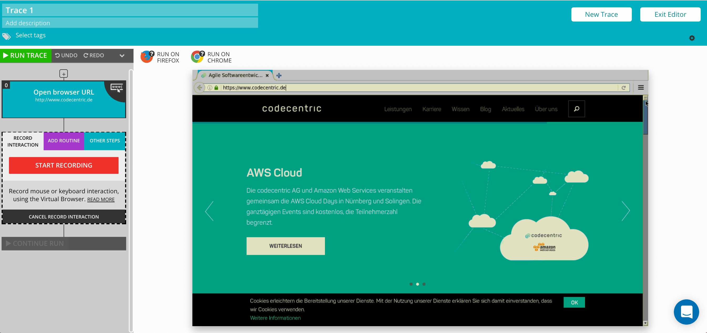 So far I have not been a big fan of recording test cases, but the recording and editing really feels intuitive. Furthermore the traces are promised to be robust against minor UI changes. Of course this remains to be seen. But after literally five minutes I had a very basic testcase clicking a few pages and checking for specific content on one of the pages.
