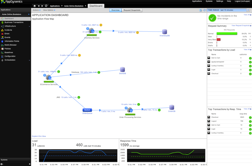 AppDynamics dashboards are created automatically and determine business transactions based on the “inner” values of an application (e.g. strus actions, URI patterns or HTTP parameters). If the default settings are not matching they can be changed with a few clicks and the system is ready for action.