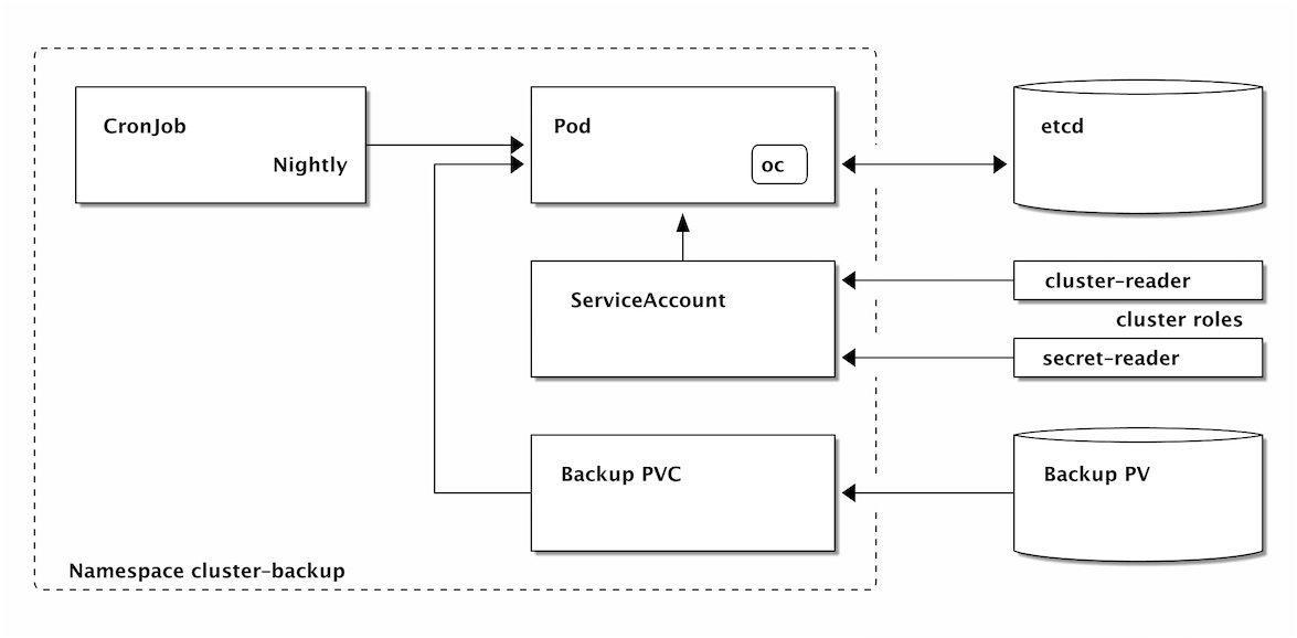 A nightly CronJob object instantiates a pod that runs the script project_export.sh. Its sole dependencies are oc and jq. It’s tempting at first glance to equip this pod with the ability to restore the exported object definitions, but that would require sweeping write access to the cluster. As mentioned earlier, the pod writes its output to persistent storage. The storage mode is ReadWriteMany, so we can access our files whether an export is currently running or not. Use the spare pod deployed alongside the CronJob object to retrieve the backup archives: