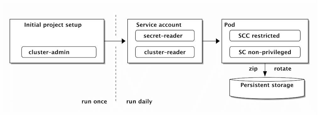 Administrator permissions are required only to create the project at the outset. The expectation is that this would be done by an authenticated user rather than a service account. As Fig. 2 illustrates, the pod that does the actual work is given security context constraint ‘restricted’ and security context ‘non-privileged’. For the most part, the pod’s service account has read access to the etcd object store and write access to its persistent volume.