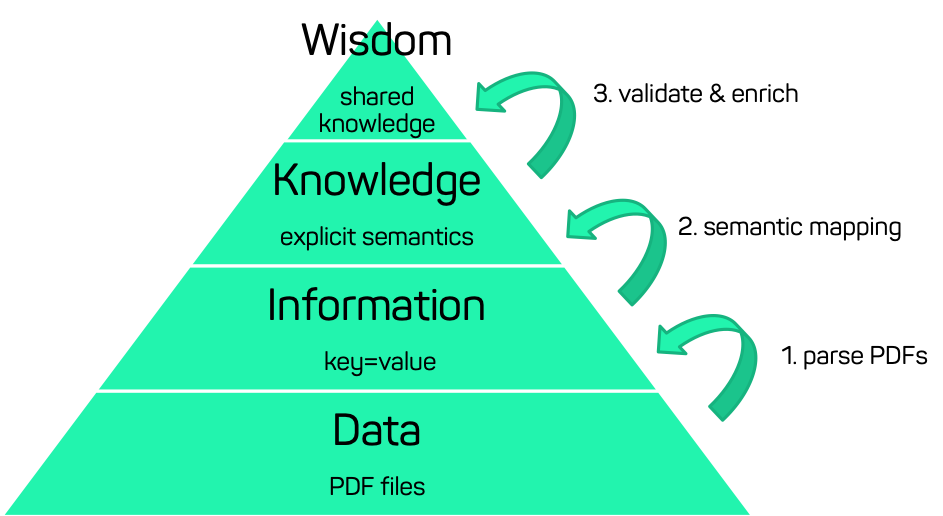 Inspired by the data-information-knowledge-hierarchy (DIKW pyramid) as part of information science, we propose a three-step approach in order to gain a shared understanding of concepts that are referenced by PDF data sheets as shown in Figure 1.