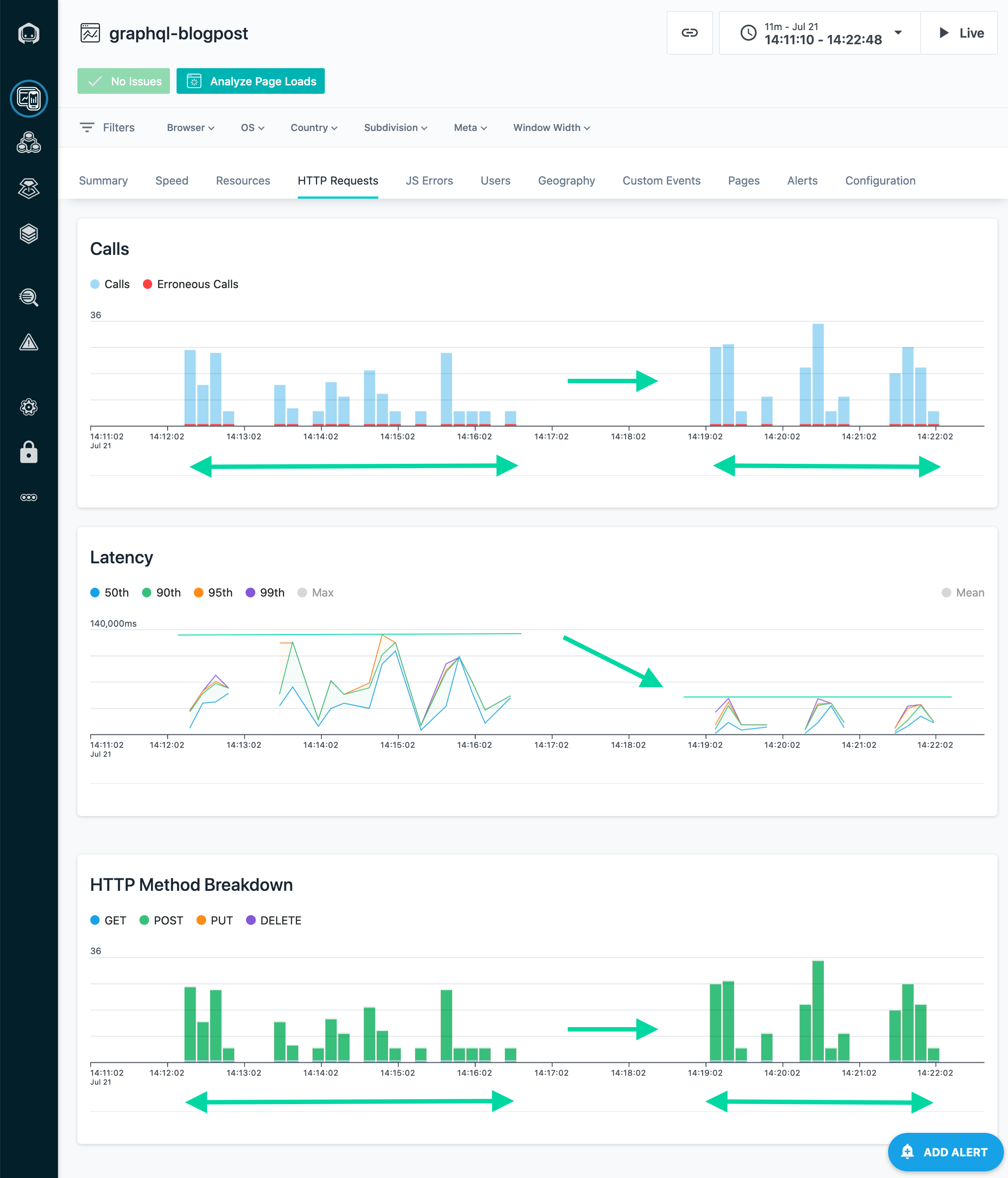 The (GraphQL) requests sent from our website to the API-gateway show how the response times for loading the data on the page goes down by factor 3, overall all pages get loaded in a shorter time.