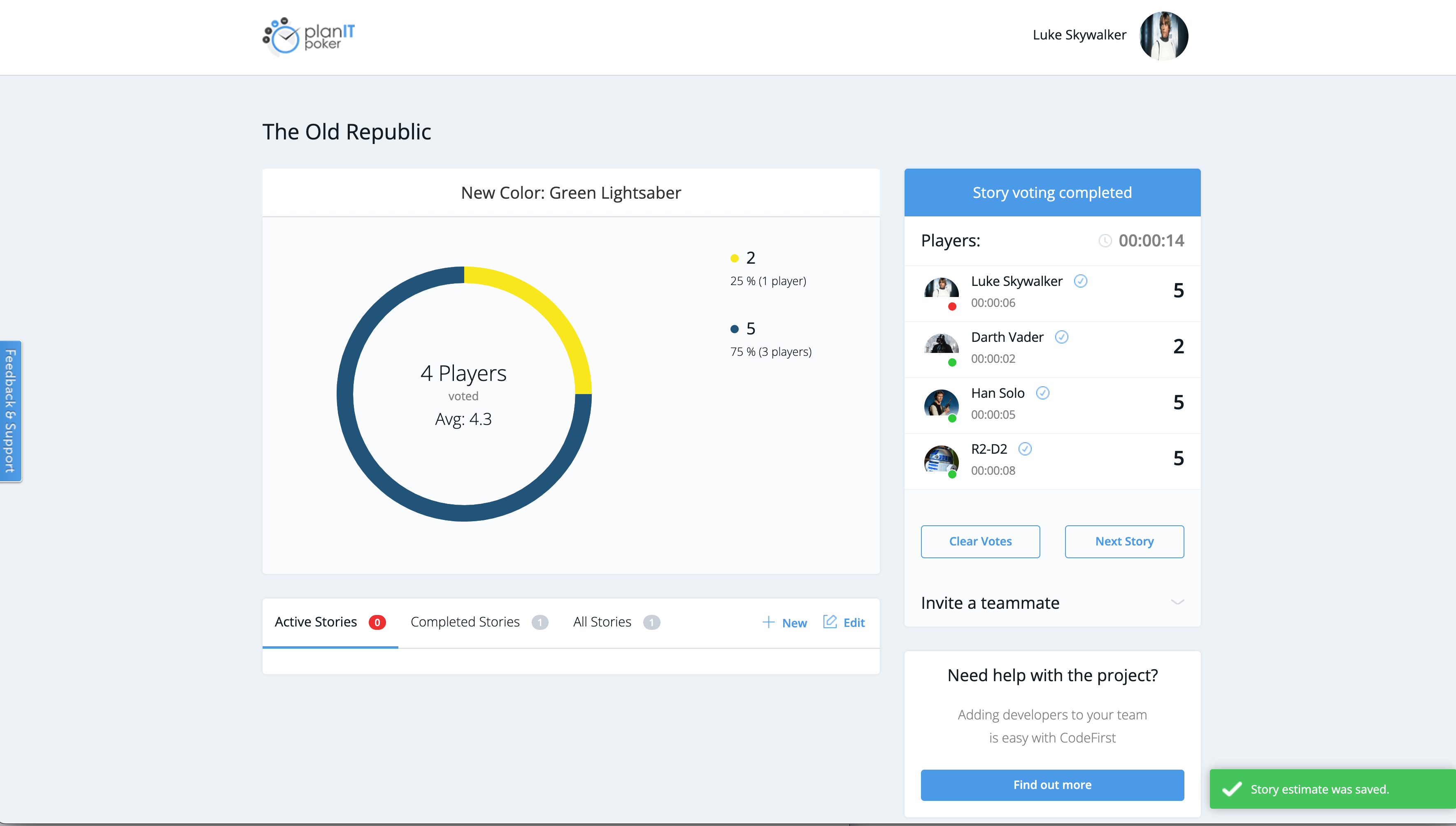 After joining codecentric I found out that some developers created their own Planning Poker tool. I know that they use it for estimation with a client. It offers the basic features I would expect from a Planning Poker Tool when it comes to functionality. You can create a room, customize the card deck, enter names for users stories and set a player name. The UX is very simple and straightforward. It is also possible to join as a spectator so that you do not need to participate in the voting.