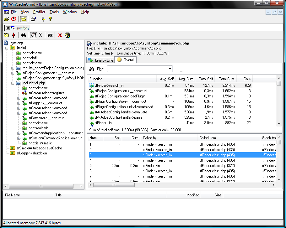For Java developers JProfiler should be a well known tool for profiling and analyzing performance of Java applications. De equivalent in PHP is called Xdebug Xdebug + CacheGrind. Xdebug is recording the calls to the PHP scripts, while WinCacheGrind is then used afterwards to evaluate the collected Data. In this example we are goung to profile a command line call of the symfony Framworks . Because I am commiter for this framework, I use Xdebug from time to time to ensure a good nonfunctional quality.