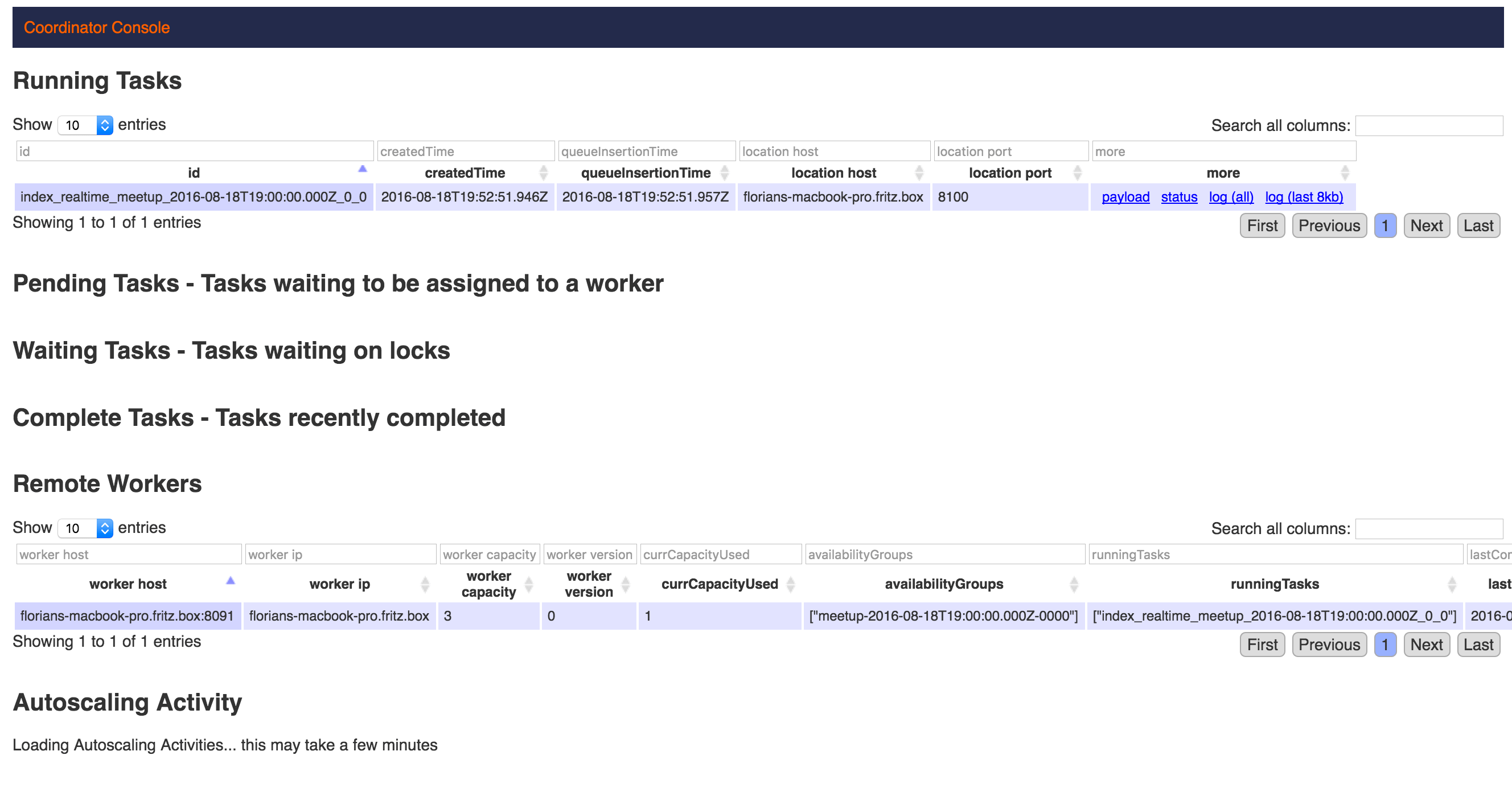 This spec basically tells Tranquility and Druid what fields in our dataset are event timestamps, dimensions and metrics. We also can aggregate latitude and longitude to a spatial dimension. In the “granularity” section, we specify that we want our segments to cover an hour and query granularity to be none – this preserves single records and is nice for our example, but probably not what you would do in production. After editing the file, we can start Druid with the steps shown above. Once running, we can ingest data by posting http requests to http://localhost:8200/v1/post/meetup. To check if the meetup ingestion is running, we can open the Overlord console: