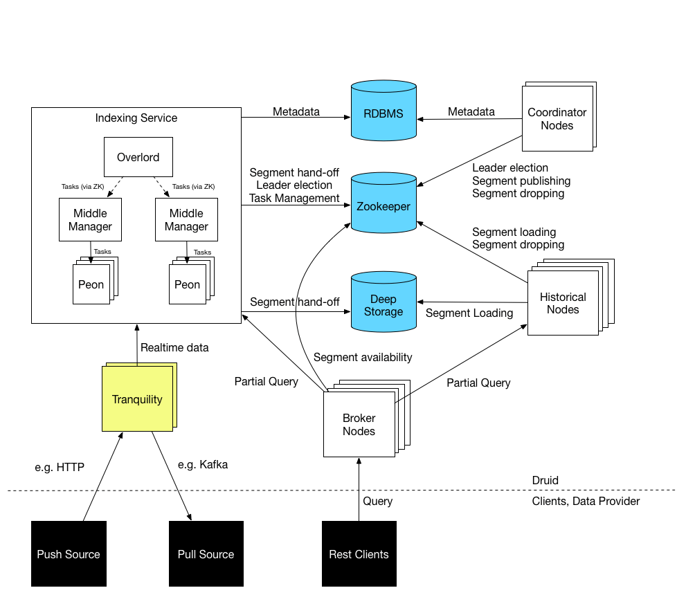 While Druid can be used to ingest batches of data, realtime data ingestion is one of its strong points. At the moment, there are two options available for realtime ingestion. The first one are Realtime Nodes, but I will not go into detail about them because they seem to be on their way out . Superseding Realtime nodes is the Indexing Service. Now, the Indexing Service is a bit more involved in itself. It is centered around a notion of tasks. The components that accepts tasks from the outside is the “Overlord”. It then forwards those tasks to so-called “Middle Managers”. These nodes in turn spawn so-called “Peons” who run in a separate JVM and can only run one task at a time. A Middle Manager can run a specified number of Peons. If all Middle Managers are occupied and the Overlord is not able to assign a new task anywhere, there is some autoscaling capability built-in to create new Middle Managers in suitable environments (e.g. AWS). So for realtime ingestion, a task is created for every new segment that is to be created. Data becomes queryable immediately after ingestion. The segments are announced in the third external dependency – a *gasp* relational database. The database contains the metadata about the segment and some rules that decide when this data should be loaded or dropped by Historicals. Once a segment is complete, it is handed off to deep storage, metadata is written and the task is completed.