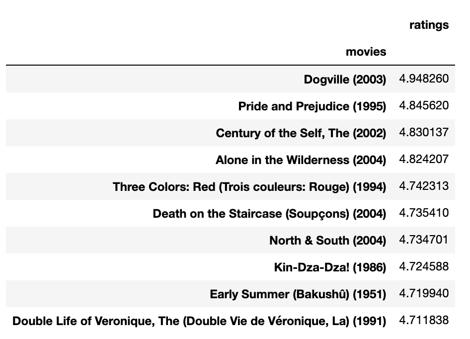 1from surprise import Dataset, Reader, SVD, accuracy 2from surprise.model_selection import train_test_split 3 4# instantiate a reader and read in our rating data 5reader = Reader(rating_scale=(1, 5)) 6data = Dataset.load_from_df(ratings_f[['userId','movieId','rating']], reader) 7 8# train SVD on 75% of known rates 9trainset, testset = train_test_split(data, test_size=.25) 10algorithm = SVD() 11algorithm.fit(trainset) 12predictions = algorithm.test(testset) 13 14# check the accuracy using Root Mean Square Error 15accuracy.rmse(predictions) 16RMSE: 0.7724 17 18# check the preferences of a particular user 19user_id = 7010 20predicted_ratings = pred_user_rating(user_id) 21pdf = pd.DataFrame(predicted_ratings, columns = ['movies','ratings']) 22pdf.sort_values('ratings', ascending=False, inplace=True) 23pdf.set_index('movies', inplace=True) 24pdf.head(10)