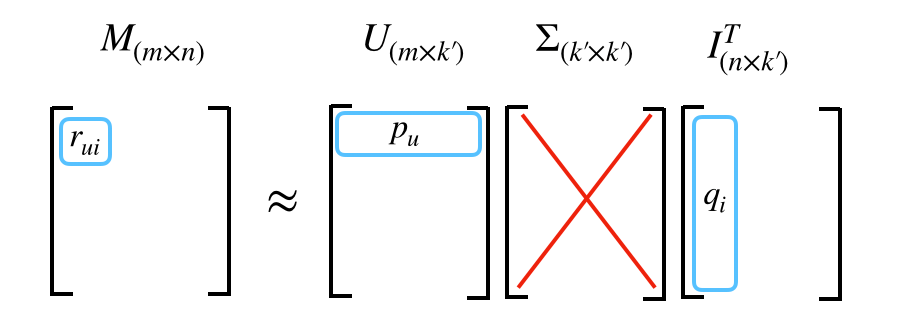 To approximate \(M\), we would like to find \(U\) and \(I\) matrices in \(k\prime\) space using all the known rates which would mean we will solve an optimisation problem. According to (2), every rate entry in \(M\), \(r_{ui}\) can be written as a dot product of \(p_u\) and \(q_i\):