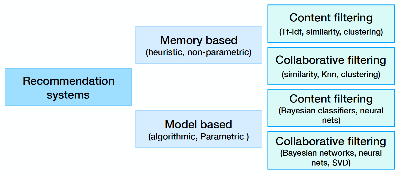 I find the above diagram the best way of categorising different methodologies for building a recommender system. I will briefly explain some of these entries in the context of movie-lens data with some code in python. Full scripts for this article are accessible on my GitHub page . Suppose someone has watched “Inception (2010)” and loved it! What can my recommender system suggest to them to watch next?