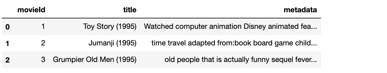 1# create metadata from tags and genres 2mixed.fillna("", inplace=True) 3mixed = pd.DataFrame(mixed.groupby('movieId')['tag'].apply( 4 lambda x: "%s" % ' '.join(x)) 5Final = pd.merge(movies, mixed, on='movieId', how='left') 6Final ['metadata'] = Final[['tag', 'genres']].apply( 7 lambda x: ' '.join(x), axis = 1) 8Final[['movieId','title','metadata']].head(3)