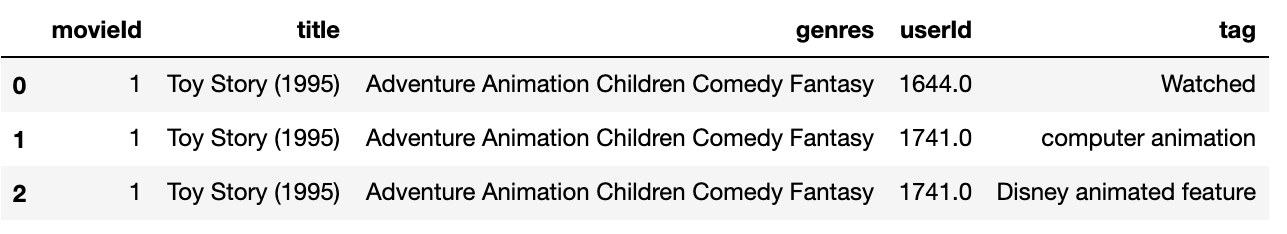 1# create a mixed dataframe of movies title, genres 2# and all user tags given to each movie 3mixed = pd.merge(movies, tags, on='movieId', how='left') 4mixed.head(3)