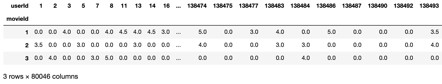 Aside from the movie metadata we have another valuable source of information at our exposure: the user rating data. Our recommender system can recommend a movie that is similar to “Inception (2010)” on the basis of user ratings. In other words, what other movies have received similar ratings by other users? This would be an example of item-item collaborative filtering. You might have heard of it as “The users who liked this item also liked these other ones.” The data set of interest would be ratings.csv and we manipulate it to form items as vectors of input rates by the users. As there are many missing votes by users, we have imputed Nan(s) by 0 which would suffice for the purpose of our collaborative filtering.
