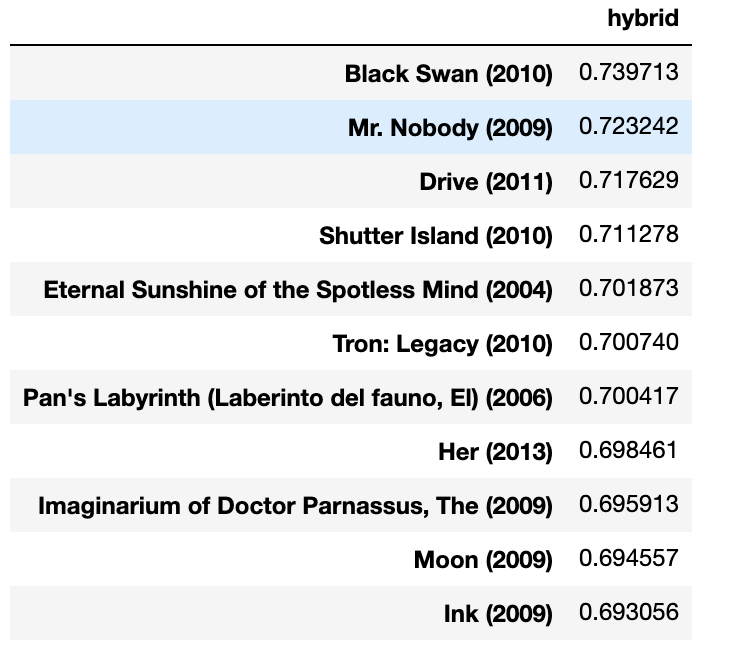 In the following, you will see how the similarity of an input movie title can be calculated with both content and collaborative latent matrices. I have also added a hybrid filter which is an average measure of similarity from both content and collaborative filtering standpoints. If I list the top 10 most similar movies to “Inception (2010)” on the basis of the hybrid measure, you will see the following list in the data frame. For me personally, the hybrid measure is predicting more reasonable titles than any of the other filters.