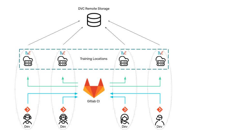 Our setup addresses teams where team members develop the ML pipeline simultaneously. Each team member uses a separate training location and therefore has access to exclusive compute power and a consistent training environment. However, they share a common remote storage location. The following picture visualizes the setup.