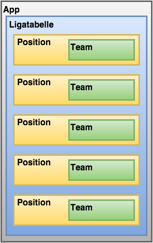 We do not access the state of our application here (and in the child components), but we use the .props-property. Those are immutable properties. Thus we only have one place where we manage our state. The team looks similar in its static structure.