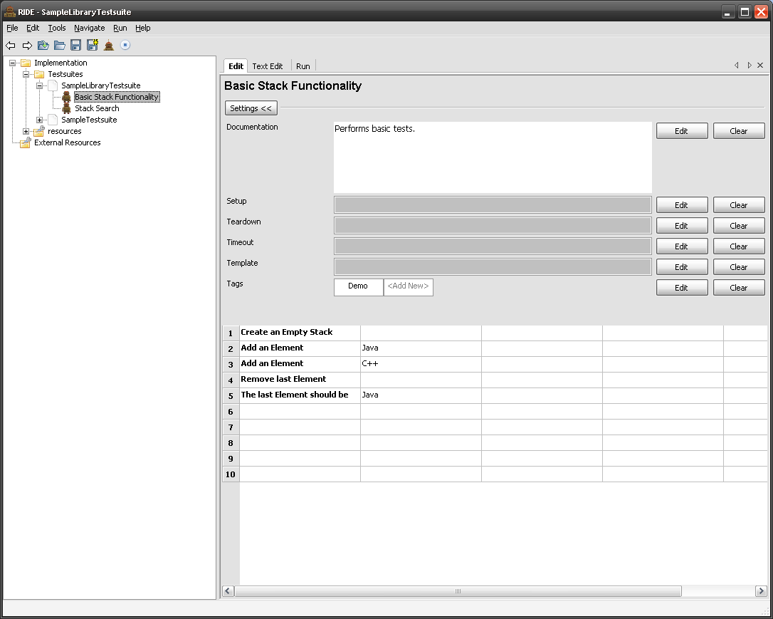 Importing our own SampleLibrary is not much different from importing any other keyword library. But as with every keyword library written in Java we have to give the full qualified package name of the corresponding Java Class in the import. Thus in RIDE this looks then as follows: