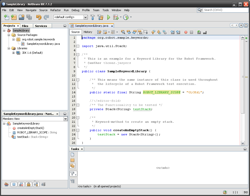 The sources of this example (including the NetBeans project files) are stored to GitHub as part of the Robot Framework Sample Project that has already been used here . Beside the Java-Sources and Project-Files the repository also contains an example how to take the Test Library into use in some Testsuite. All this will be shown in the course of this article.
