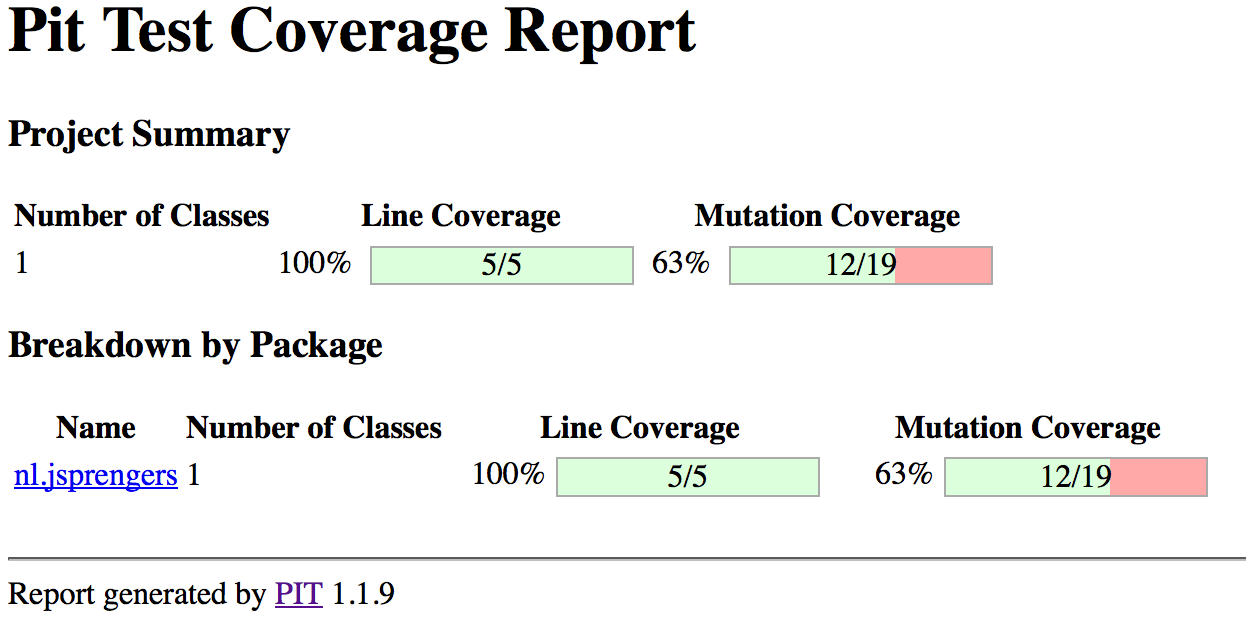 Cool! We have 100% rock solid coverage with only two tests. Let’s see what PIT has to say about this brave effort. If you run