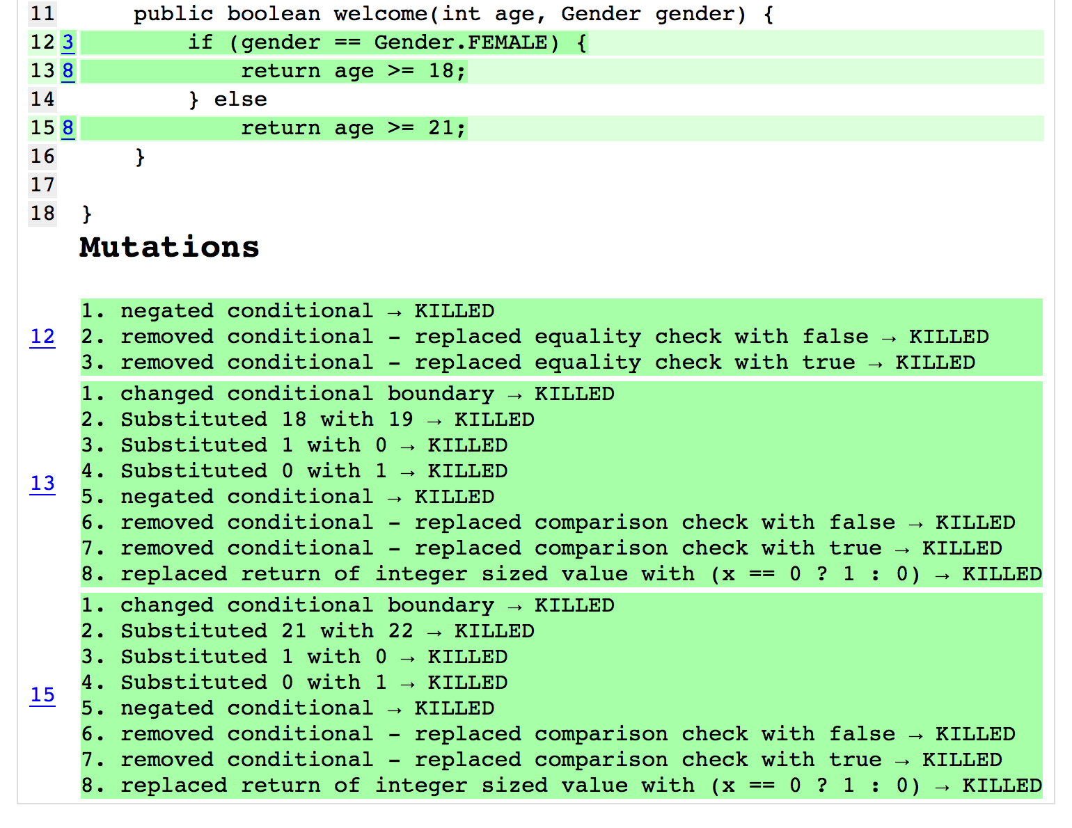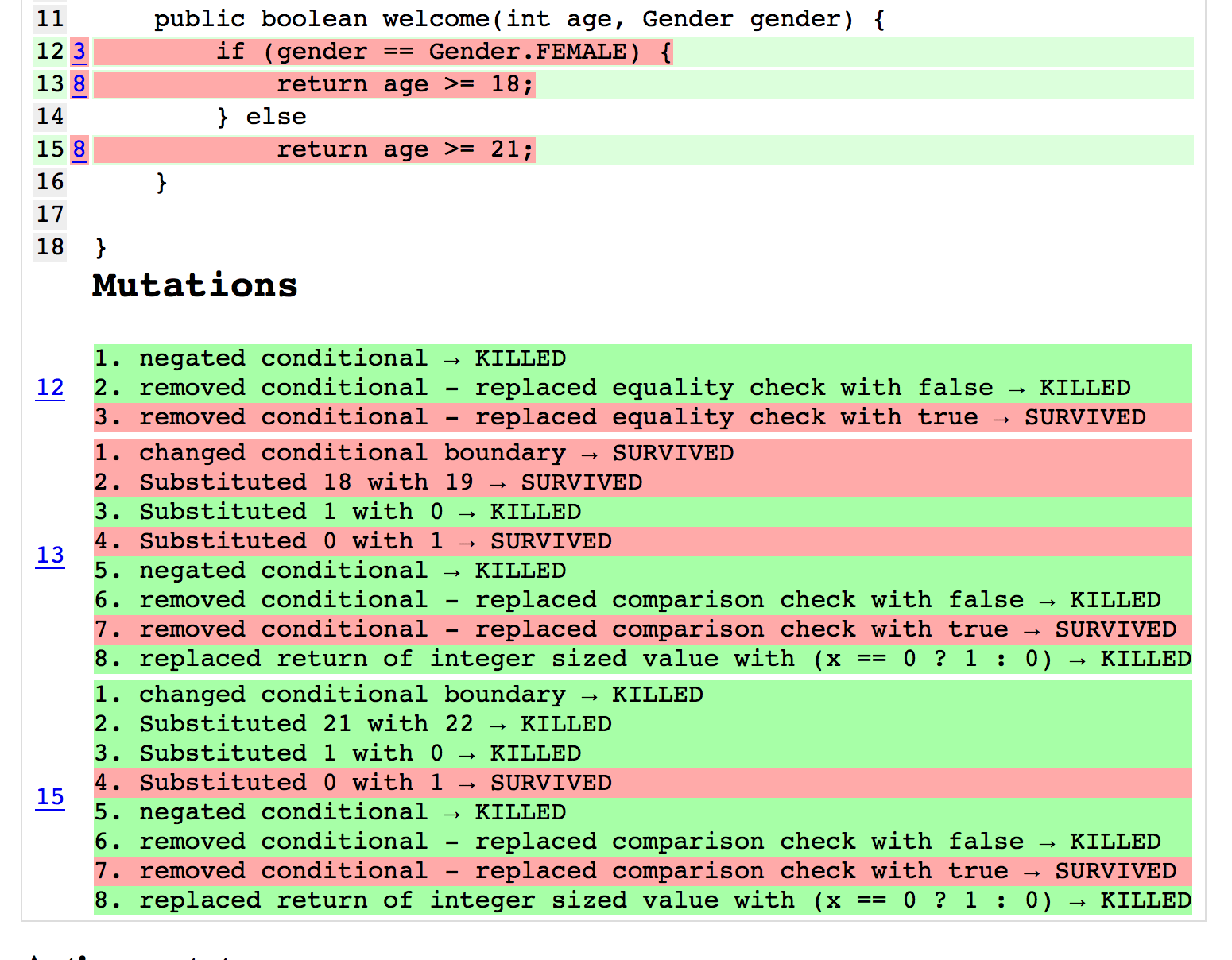 No so great… PIT inserted 19 mutants, of which seven were left to survive, despite our 100% coverage. Let’s take a detailed look.