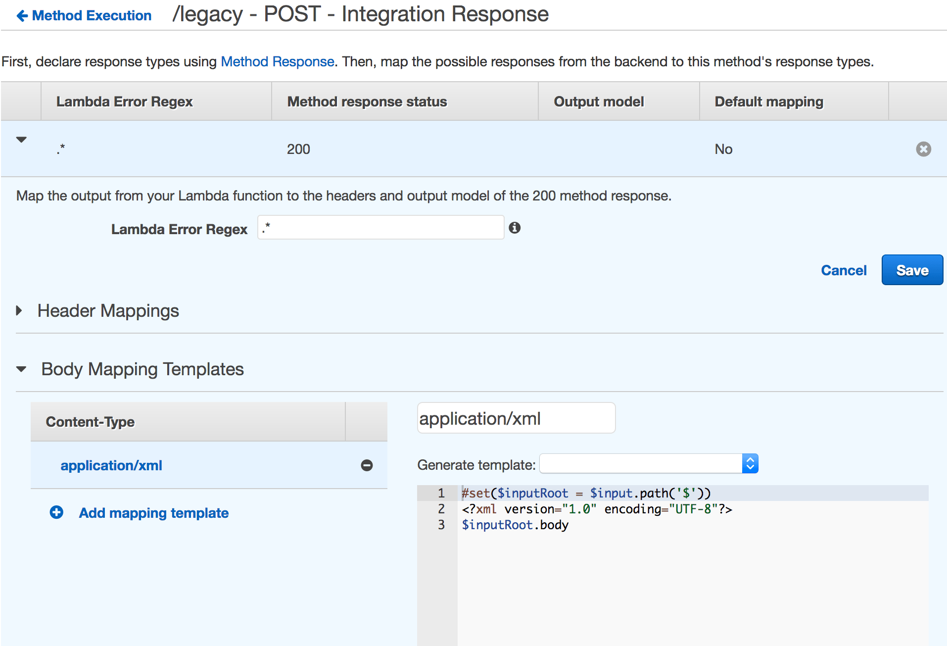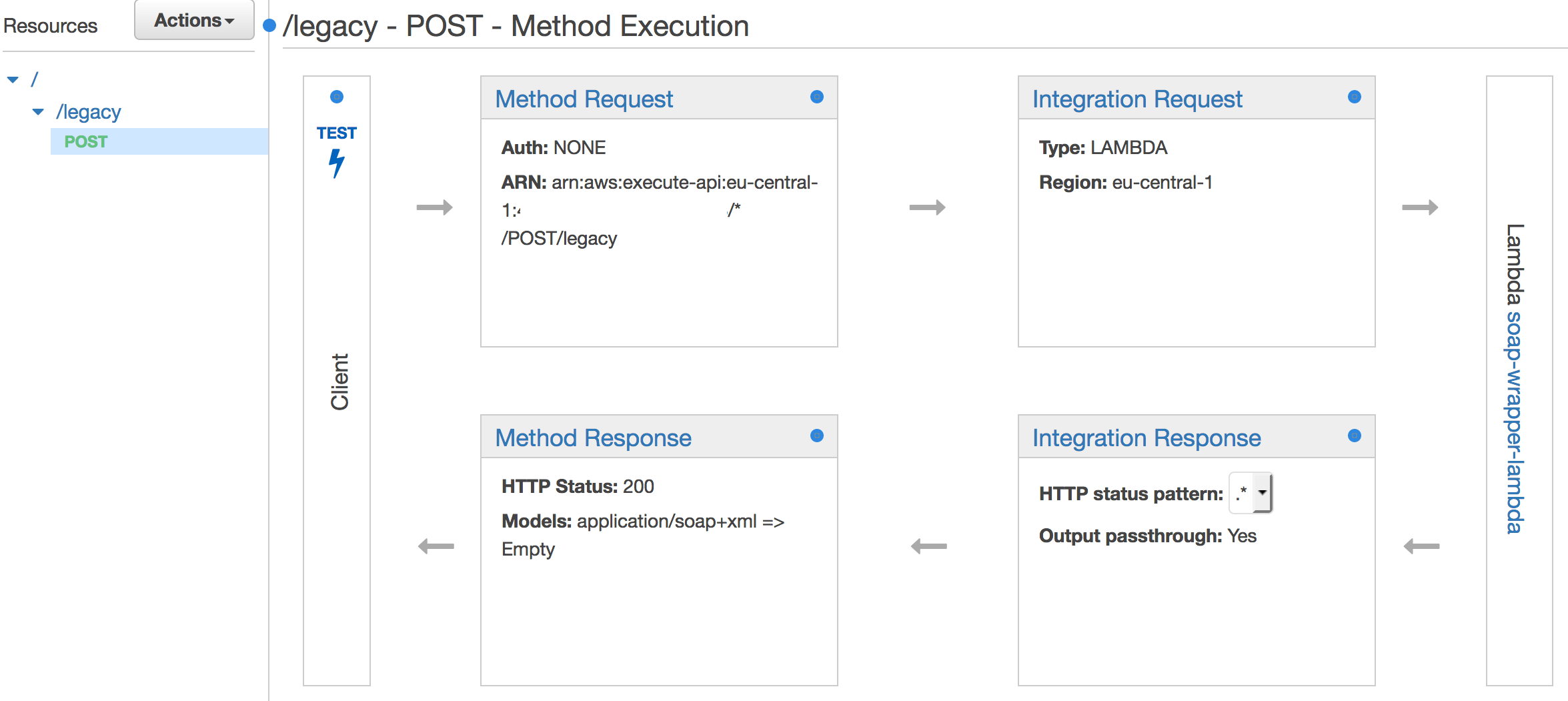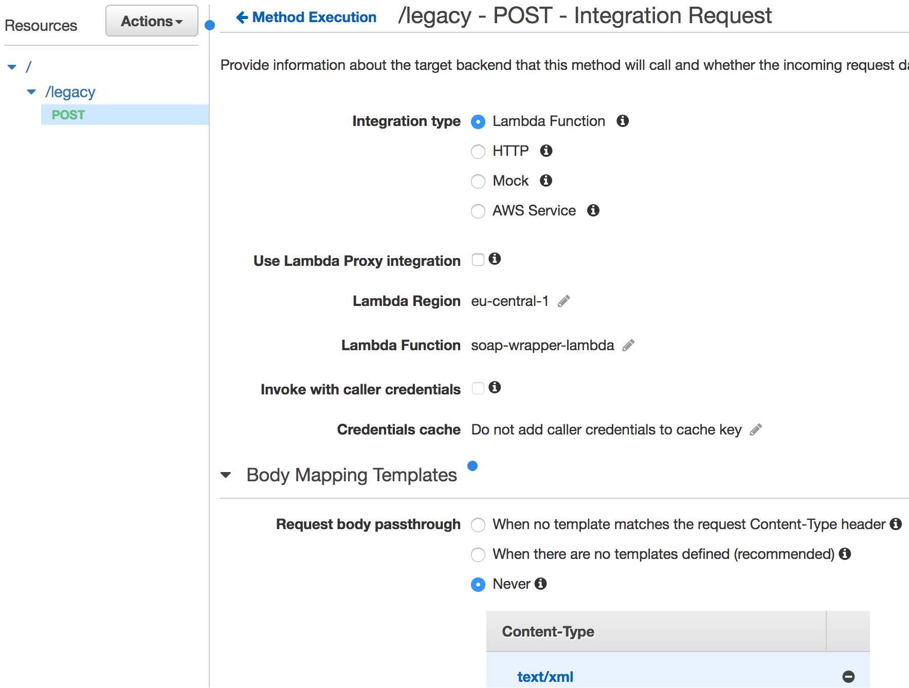 Using the AWS Management Console for the API Gateway, we are able to set up our SOAP Wrapper API within minutes. We just have to keep in mind to map the incoming request content, which is XML, to JSON (as the Lambda function only speaks JSON). Conversely we map the outgoing response content to XML, in order to emulate an actual SOAP response. This can be done with an Integration Request and an Integration Response within the AWS API Gateway, respectively. We define a content type and a mapping template in each of these method execution steps to process the body of the request / response. Within the mapping template we can modify the content of a request / response with Velocity .