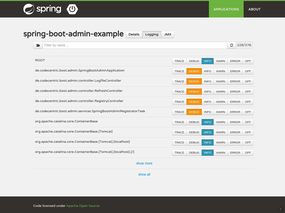 After some time we released the next version of Spring Boot Admin with some great new features, like UI-based Log Level Management, more detailed and redesigned Metrics Dashboards and a JMX Admininstration UI. A big thanks to our main contributer Johannes who has implemented the main part of this release. This blog post gives you a short overview of the new features and fixed bugs. For further informations and installation instructions please have a look at Github .
