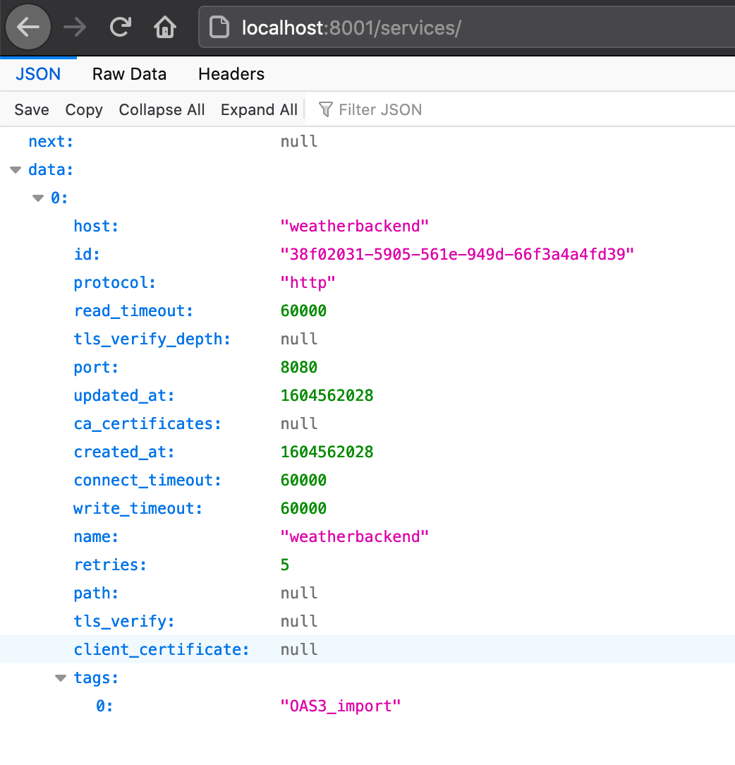 Now let’s look if our Spring Boot app is ready to be accessed through our API Gateway. Specifically, we need to examine the configured Kong services and find out if the OpenAPI spec import worked in the way we’d expected it in the first place. Therefore let’s look at the list of all currently registered Kong services at http://localhost:8001/services :