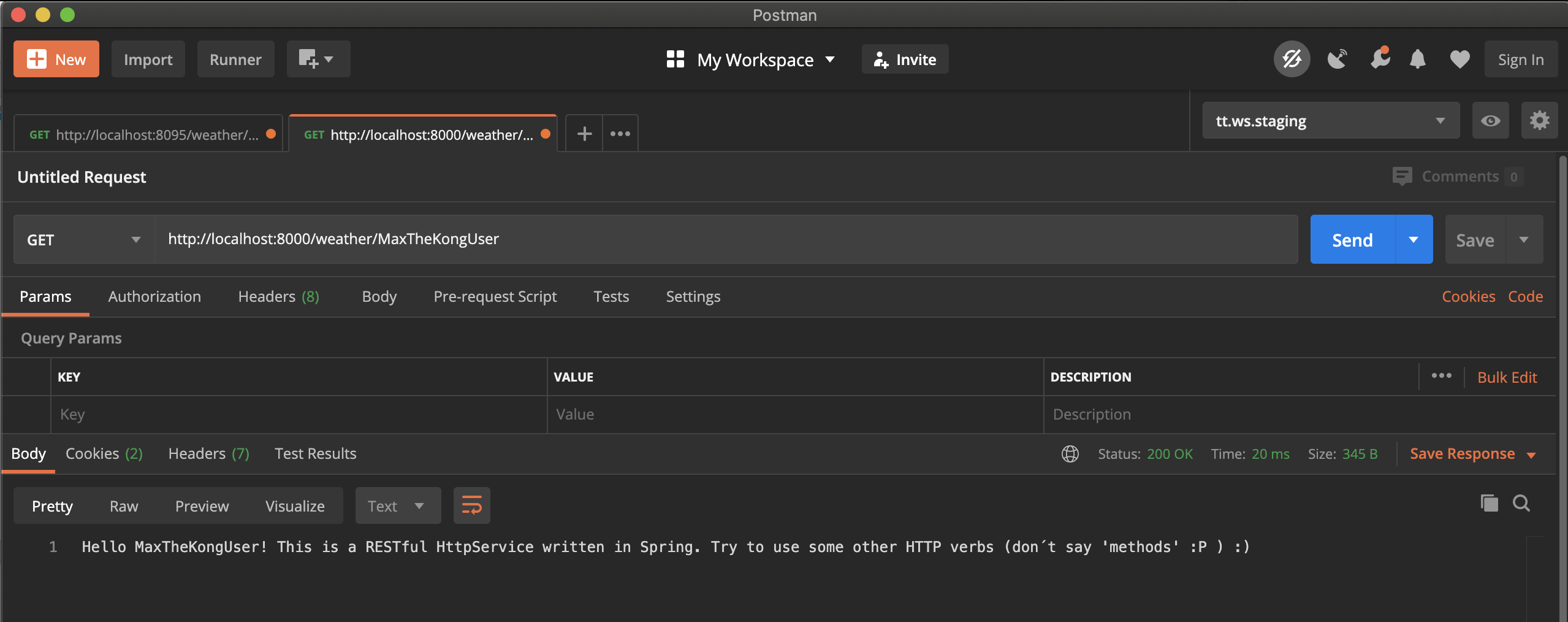 Now we should have everything in place to access our Spring Boot service through Kong! We can now use Postman , Insomnia Core or another HTTP client to access our Spring Boot app with a GET on http://localhost:8000/weather/MaxTheKongUser