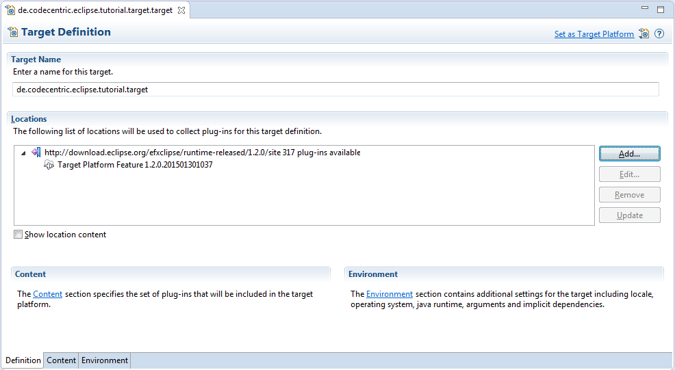 - Open the target definition de.codecentric.eclipse.tutorial.target.target in the project de.codecentric.eclipse.tutorial.target