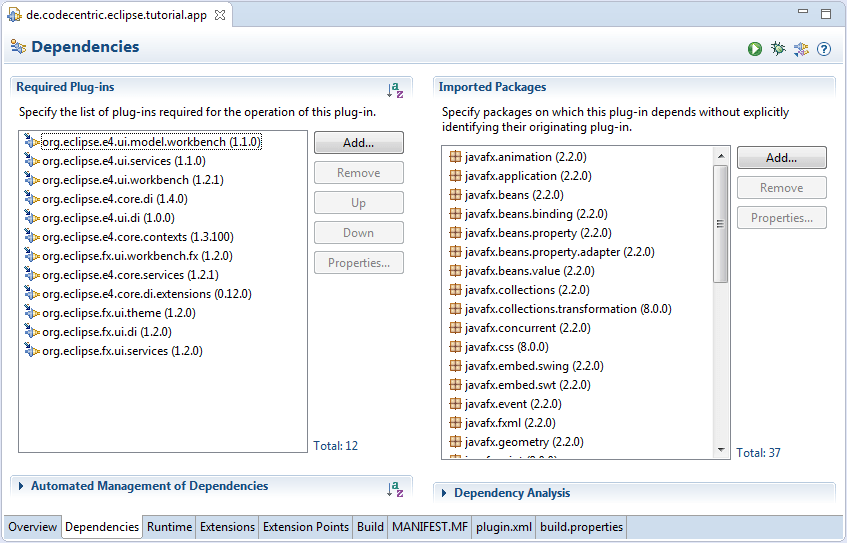 - Open the file MANIFEST.MF in the project de.codecentric.eclipse.tutorial.app