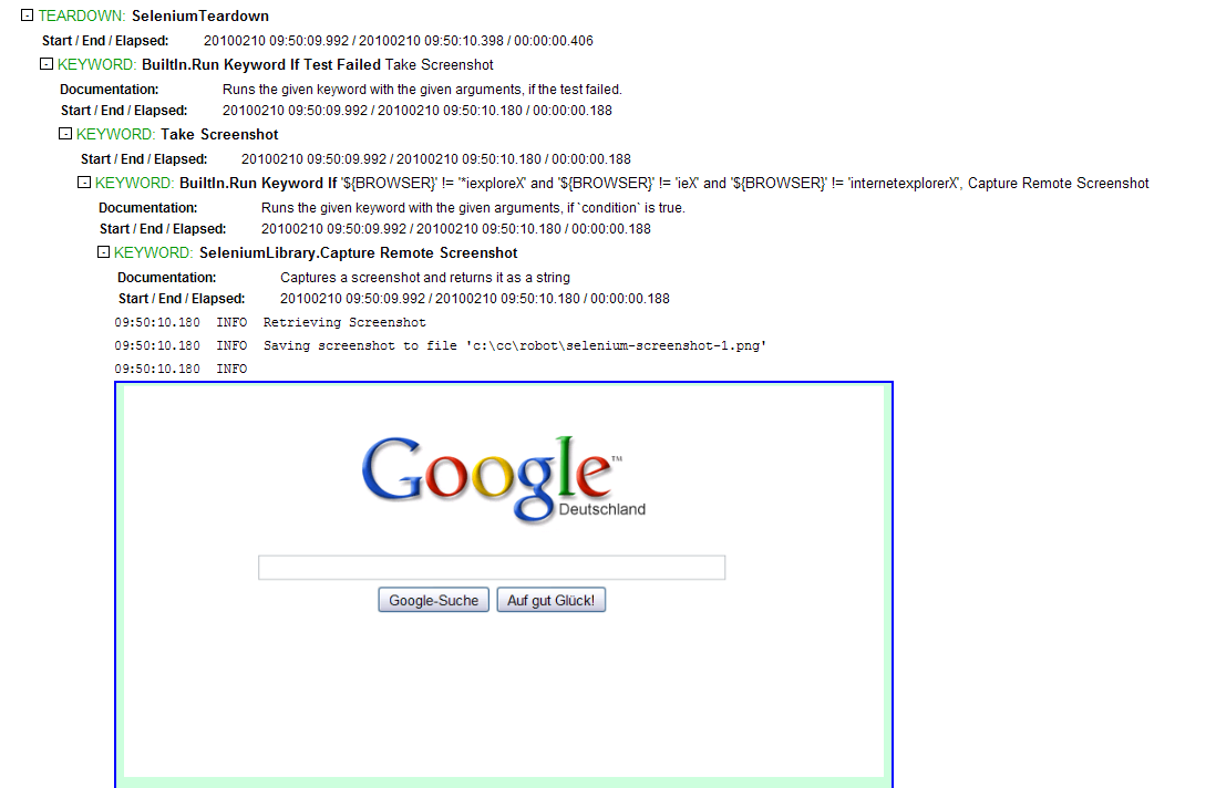 Now, in every teardown it is checked if the test failed. If this is the case, the keyword “Take Screenshot” will be called. This checks for the correct browser, and only if its not the Internet Explorer, it calls the new Keyword “Capture Remote Screenshot”, which embeds the screenshot in the robot logfile: