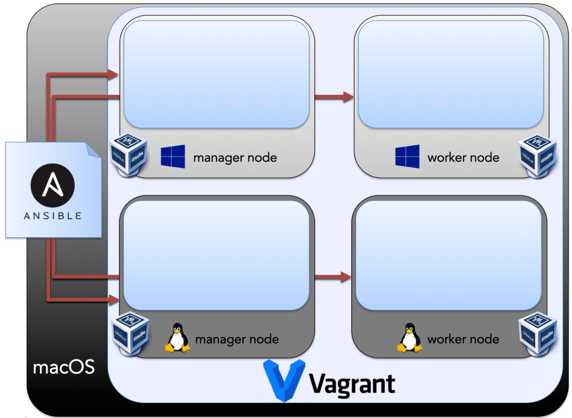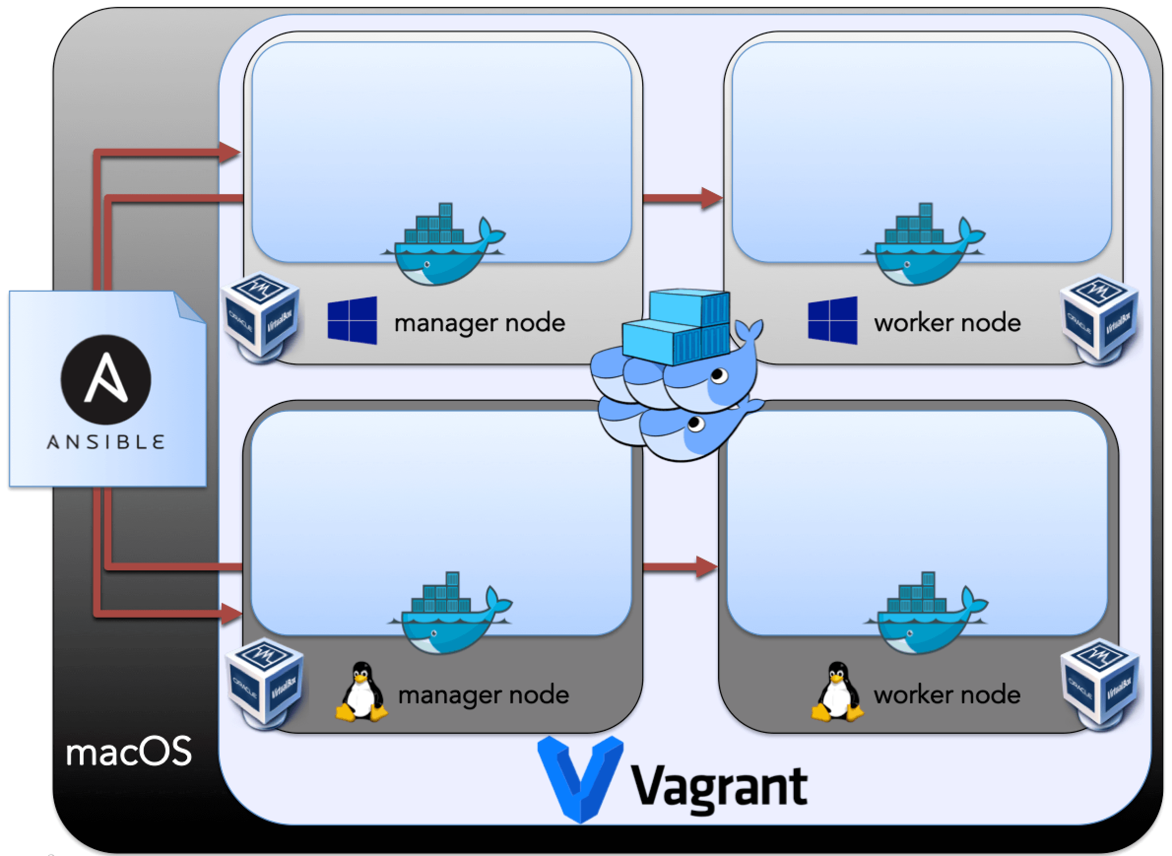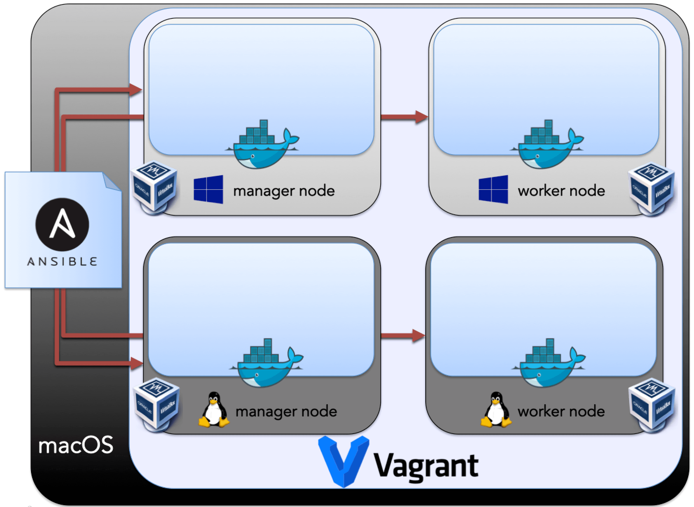 logo sources: Windows icon , Linux logo , Vagrant logo , VirtualBox logo , Ansible logo , Docker & Docker Swarm logo