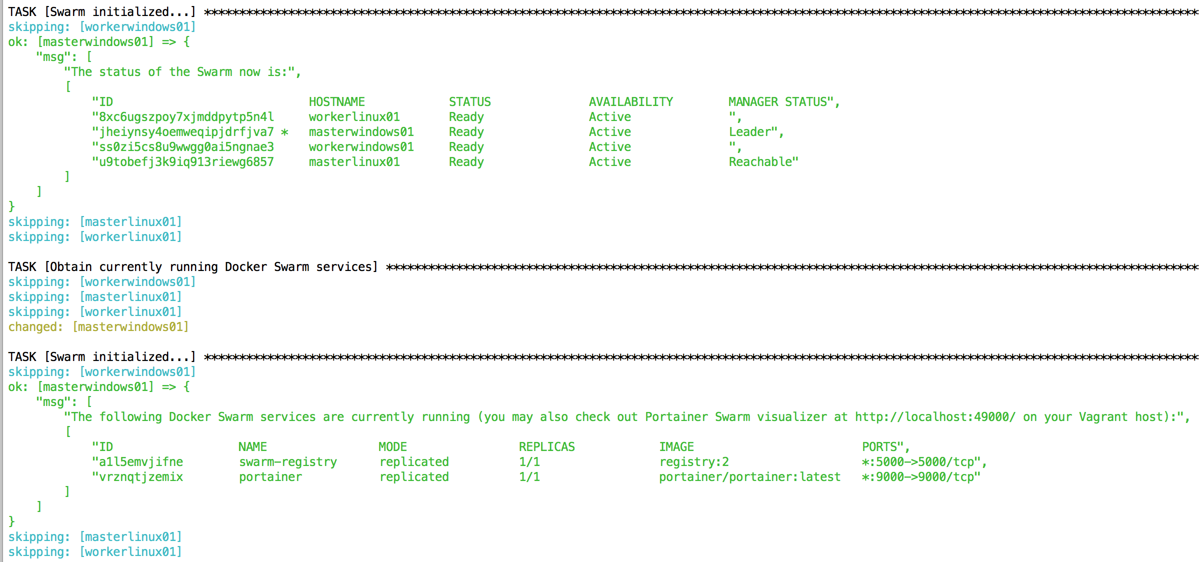 We´ve reached the last step in our playbook initialize-docker-swarm.yml . The last task includes the playbook display-swarm-status.yml , which doesn´t really do anything on our machines – but outputs the current Swarm status to the console that executes our playbook: