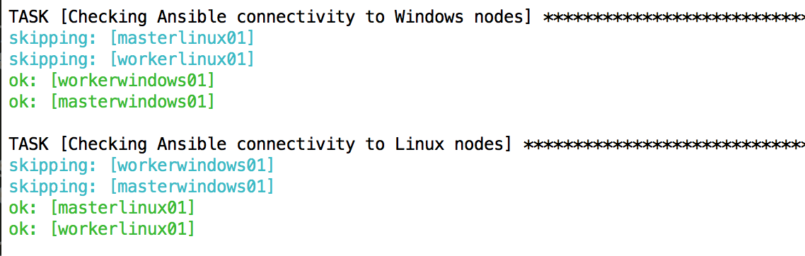 With this configuration, we´re finally able to access both Windows and Linux boxes within one Ansible playbook. Let´s try this! Just be sure to have fired up all the machines in the cluster via vagrant up. To try the Ansible connectivity e.g. to the Windows Worker node, run the following:
