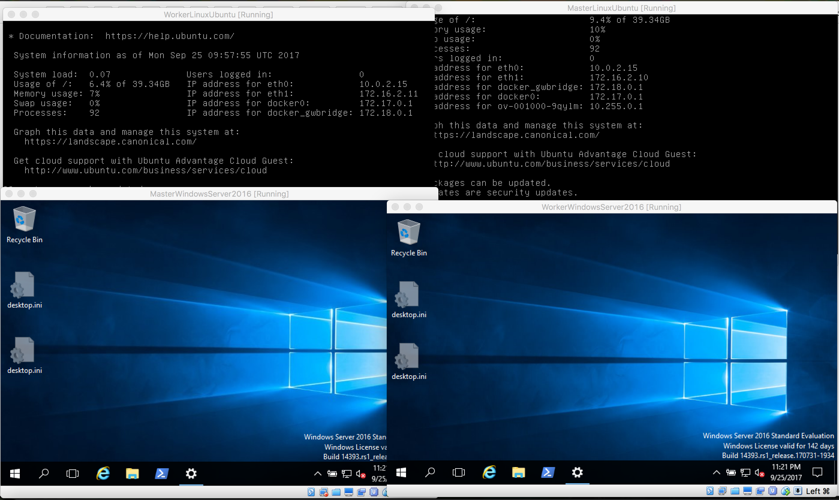 It defines four machines to show the many possible solutions in a hybrid Docker Swarm cluster containing Windows and Linux boxes: Manager and Worker nodes, also both as Windows and Linux machines.