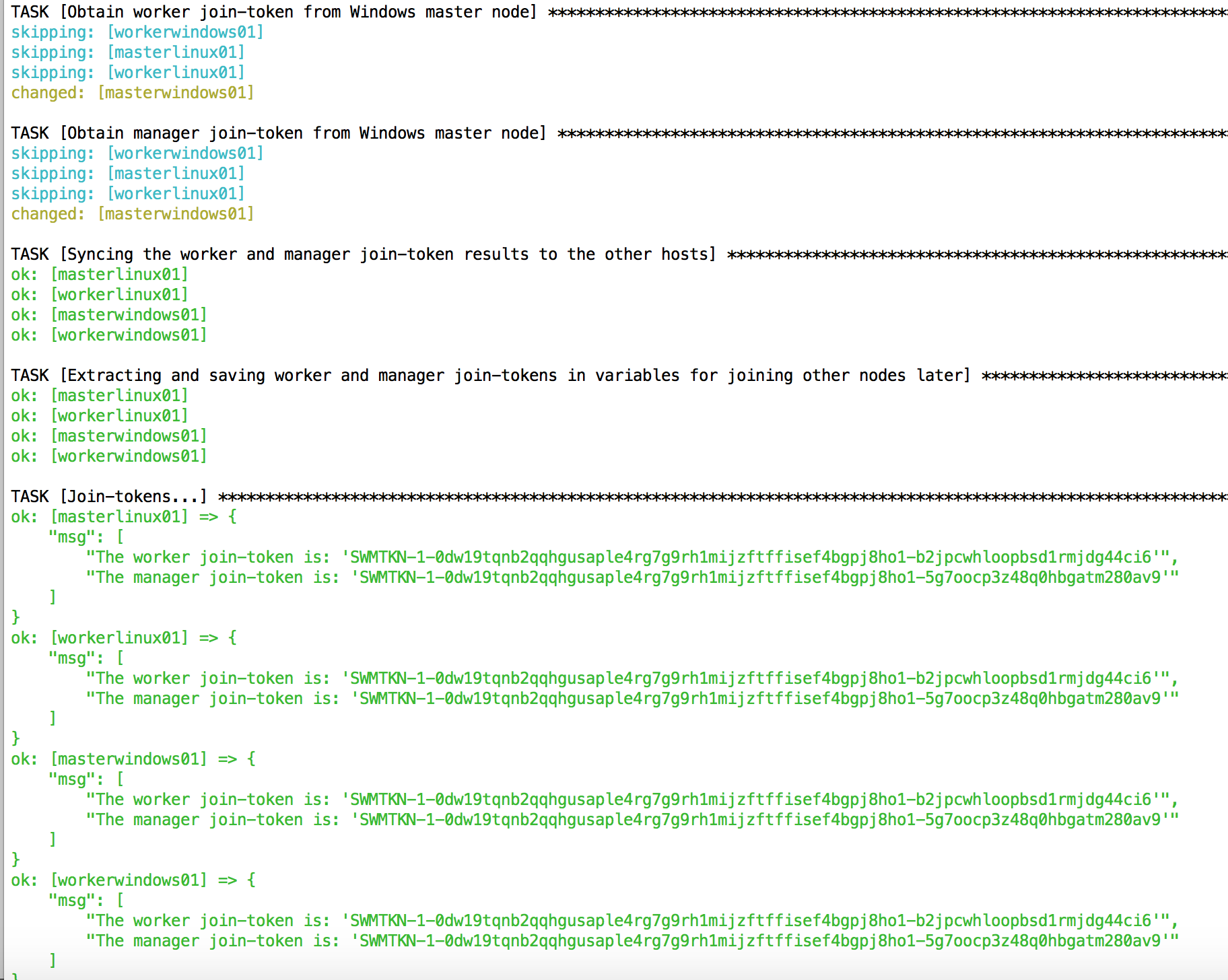 The hostvars['masterwindows01'] statement gives us access to the masterwindows01 variables. The trailing ['worker_token_result'] points us to the registered result of the docker swarm join-token commands. And inside the following set_fact module, the only needed value is extracted with worker_token_result_host_sync.stdout.splitlines()[0]. Now looking onto the console output, the debug module prints all the extracted tokens for us.