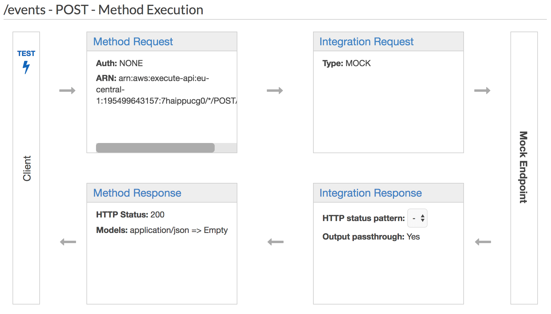 In our particular case we will have one resource called events which accepts requests made with the POST method. The definitions of method request/response and integration request/response are fairly simple, as we are using a mock endpoint. We configured the API to return status code 200 (OK) on every request. The following figure illustrates the final result after creating the API.