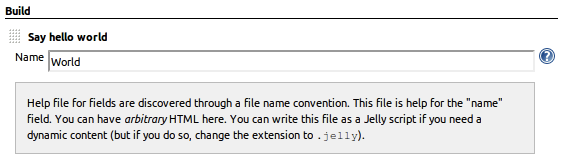 You will find a section that looks like the following diagram. The plugin will print out “Hello World” if you run it during a build step. You can configure if it should greet you in english or french by selecting the checkbox.