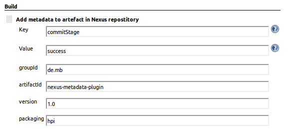 Afterwards you will find the nexus-metadata-plugin.hpi plugin in the /target folder. Once you deploy the plugin and configure each build step of the continuous delivery build pipeline the deployed artifact in Nexus will have the metadata attached, see diagram.