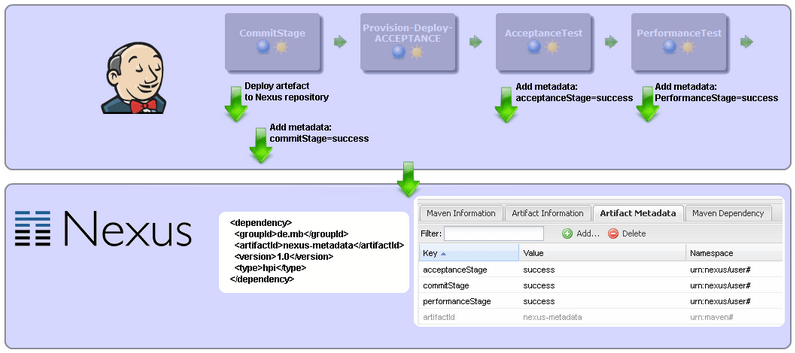 There comes a time in every developers life when you need write your own extension, addon or plugin when using open source software. In my case I was looking for a way to improve the Continuous Delivery Pipeline we setup using the Jenkins CI server and the Build Pipeline Plugin in a previous blog series [1] . In particular I wanted to add additional metadata to the deployed artifacts after each successful build step. This blog article will guide you through the creation of a Jenkins plugin. After that we will enhance the plugin to do some actual work and add custom metadata to the artifact in the Nexus repository. The following diagram shows the different steps in the build pipeline (CommitStage, AcceptanceTestStage, PerformanceTestStage). The CommitStage builds the software artifact and deploys it to Nexus. After each successful build step metadata is added to the deployed artifact, i.e. commitStage=success.