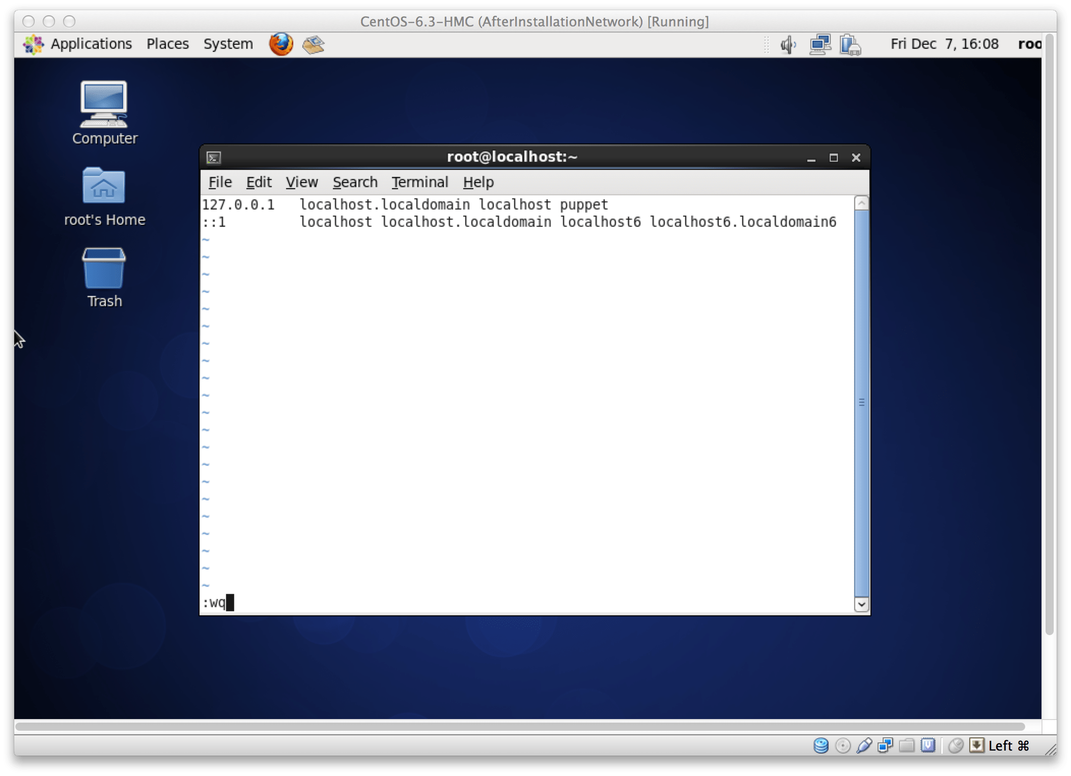 - Edit the File “/etc/hosts” so that it looks like in the following screenshot. It is important that the first entry is “localhost.localdomain”, otherwise the HMC-Setup will not work, because you will get a problem with the hostname resolution.