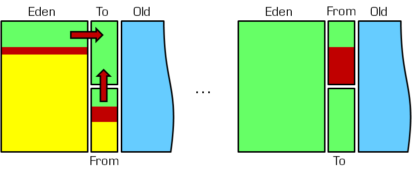 Example showing the initial state and the result of a young generation GC. Free space is green, objects not referenced anymore are yellow, and still referenced objects are red. In this example, the survivor spaces are large enough so that no objects need to be moved into the old generation.